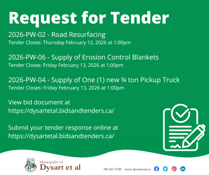 The Municipality of Dysart et al uses a digital procurement management platform called Bids and Tenders to source goods and services, including public works maintenance and construction.