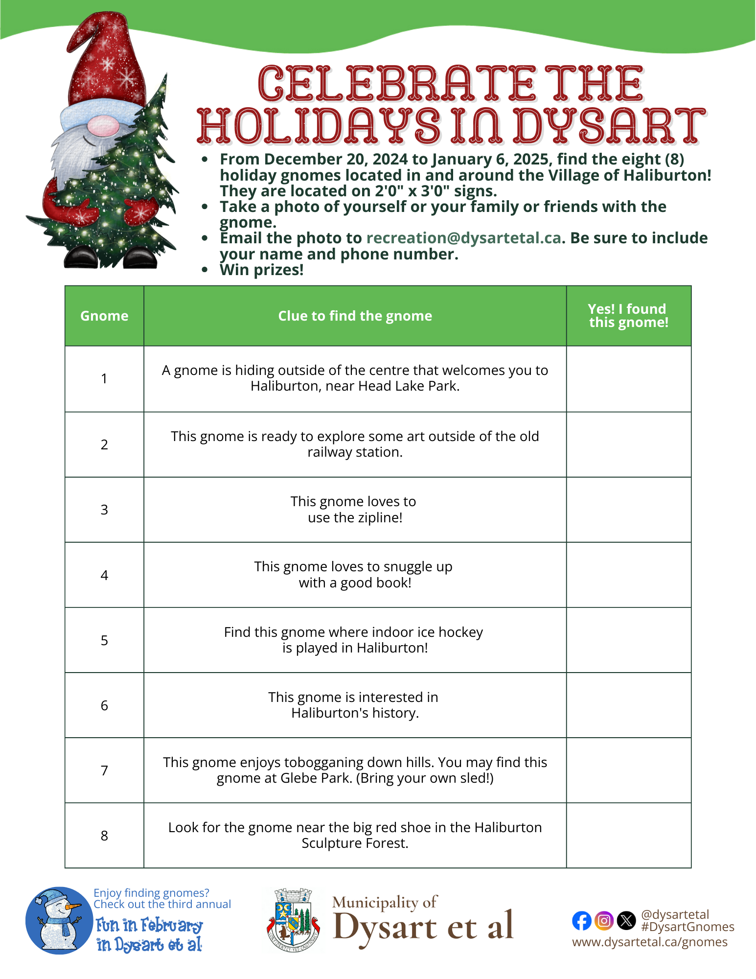 - Find a holiday gnome. They are located on 2'0" x 3'0" signs in and around the Village of Haliburton.